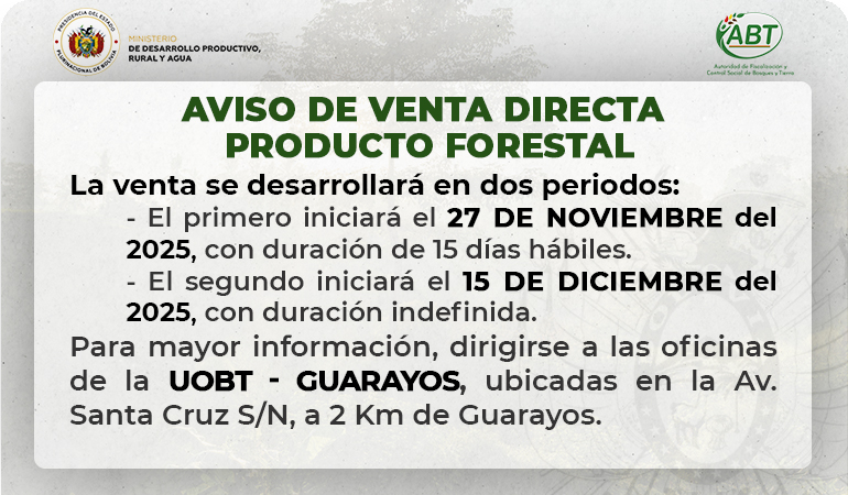 La Autoridad de Fiscalización y Control Social de Bosques y Tierra (ABT) informa al público en general que se llevará a cabo la venta directa de producto forestal, en cumplimiento de la normativa vigente.