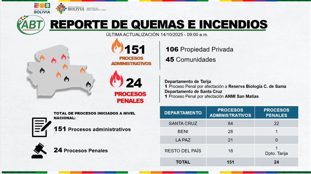 La Autoridad de Fiscalización y Control Social de Bosques y Tierra – ABT, en el marco de sus atribuciones y competencias establecidas en la normativa vigente, continúa realizando de manera permanente operativos de control y fiscalización en diferentes regiones del país, con el objetivo de iniciar procesos administrativos sancionadores por la comisión de quemas ilegales, en cumplimiento del Decreto Supremo N° 5203.