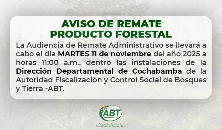 La ABT comunica a la ciudadanía que la Audiencia de Remate Administrativo de Producto Forestal se llevará a cabo el martes 11 de noviembre de 2025, a horas 11:00 a.m., en dependencias de la Dirección Departamental de Cochabamba.