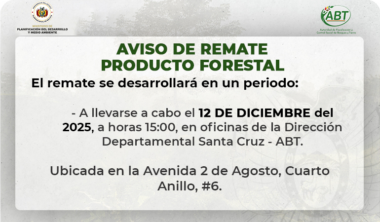 La Autoridad de Fiscalización y Control Social de Bosques y Tierra, a través de la Unidad de Transparencia y Lucha Contra la Corrupción, tienen el agrado de invitar a usted(es), a participar de la: Informe de Rendición de Cuentas Inicial - Gestión 2025, en la modalidad virtual, a través de su página de Facebook Live de ABT Bolivia.