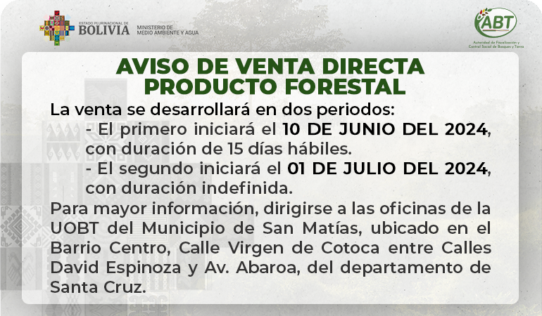 El remate administrativo iniciará el día martes 22 de octubre del 2024, a horas 10:00 a.m., en las oficinas de la Unidad Operativa de Bosques y Tierra de Concepción, ubicadas en la localidad de Concepción en la Zona 2 detrás de la Antena de Cotas, del departamento de Santa Cruz.